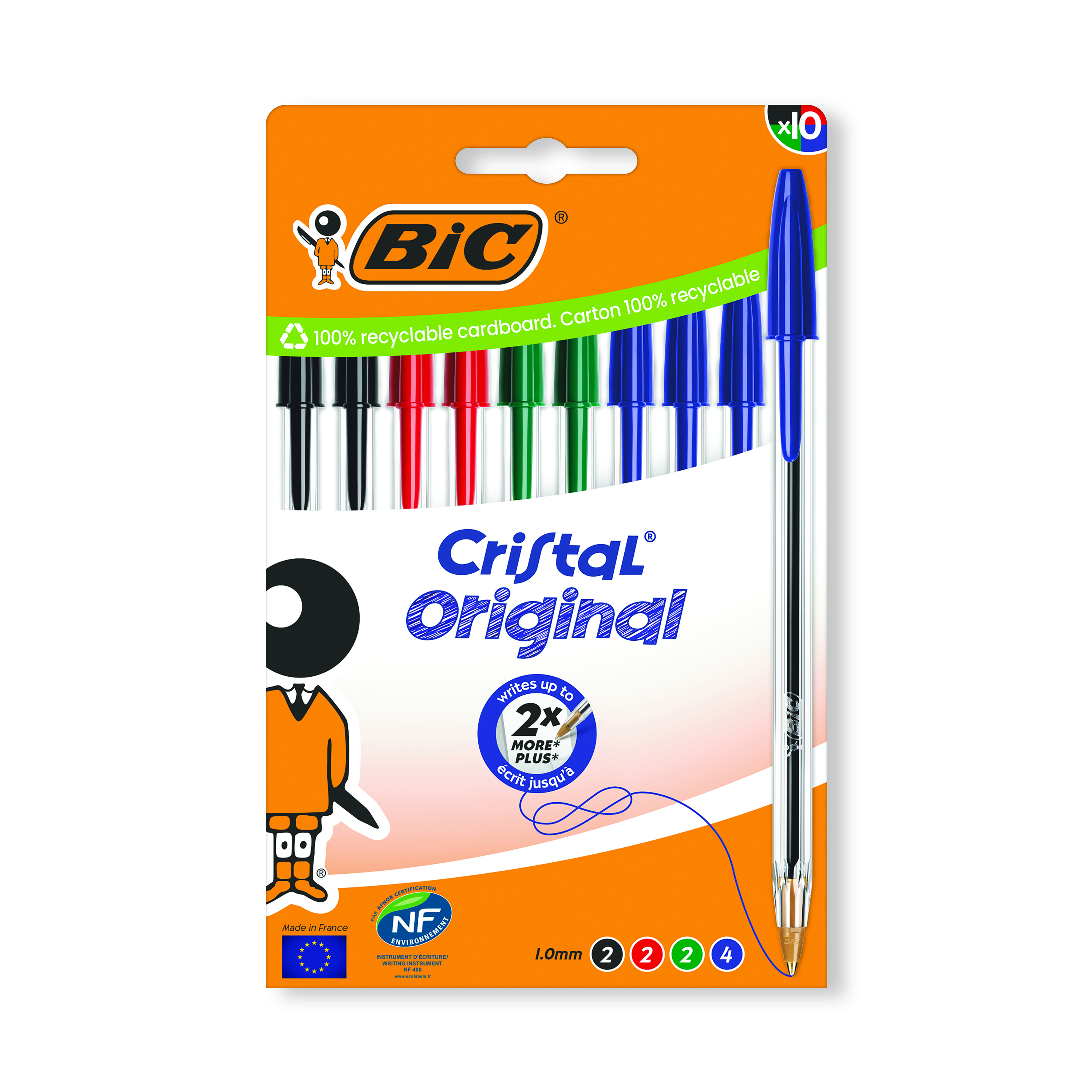 These Bic Cristal Ballpoint Pens feature a durable tungsten carbide ball mechanism and smooth, instant drying ink for reliable, everyday use. The medium 1.0mm tip produces a thin 0.32mm line. The hexagonal barrel includes a coloured cap and end plug that matches the ink colour for easy identification. This pack contains 10 assorted pens in a recyclable cardboard box.