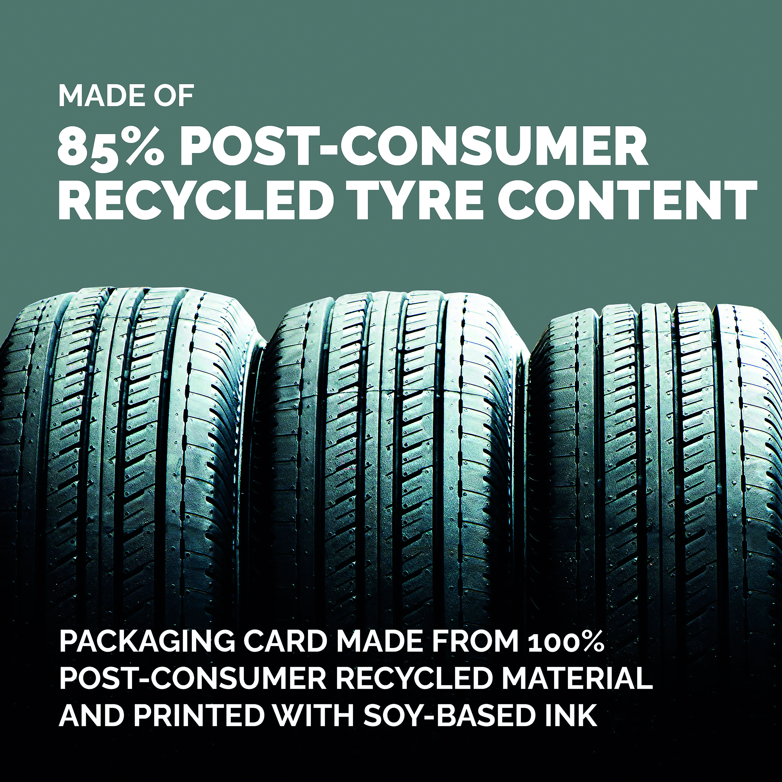 - Packaging card made from 100% post-consumer recycled material and printed with soy-based ink