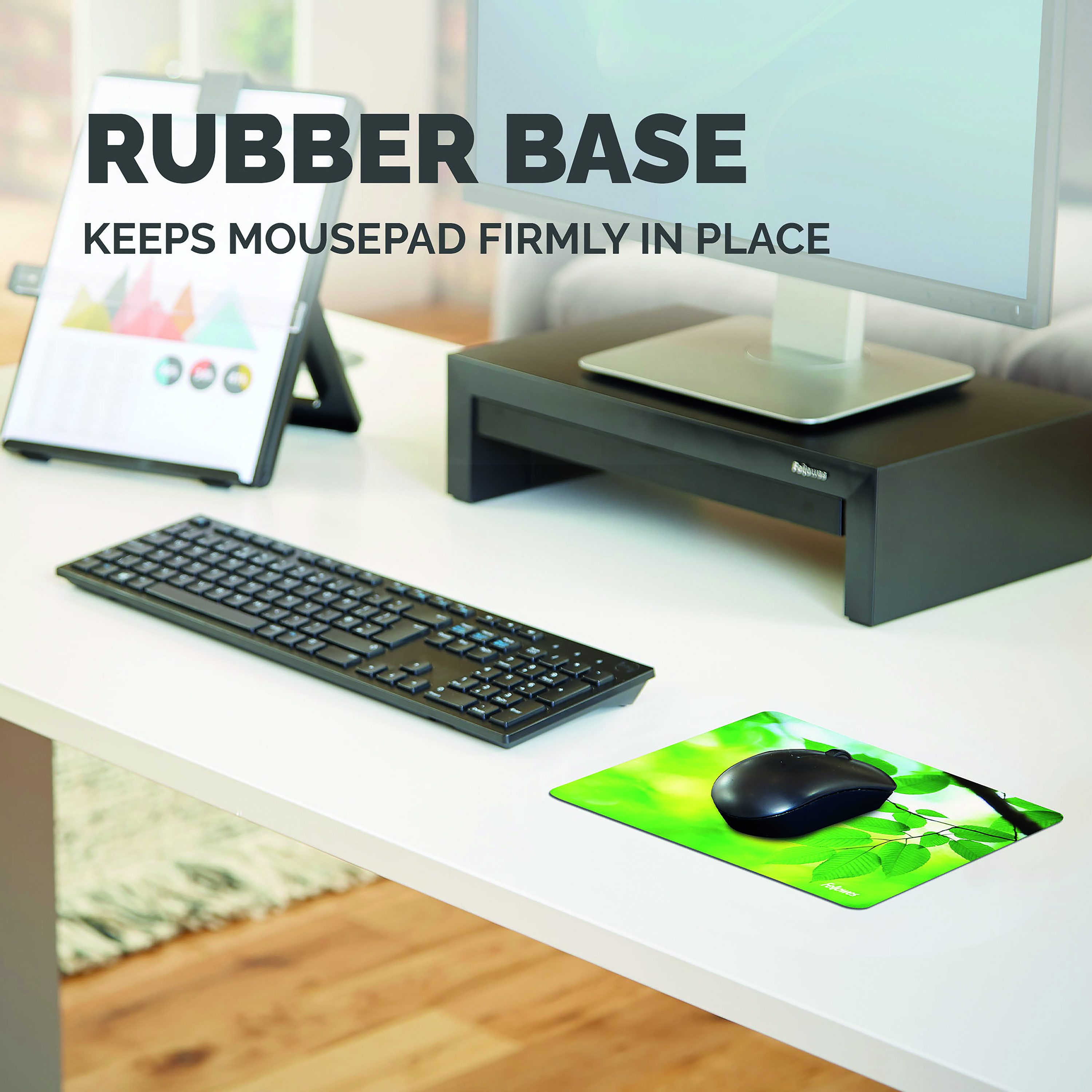 - Rubber base keeps mousepad firmly in place all day whilst protecting desktop from scratches